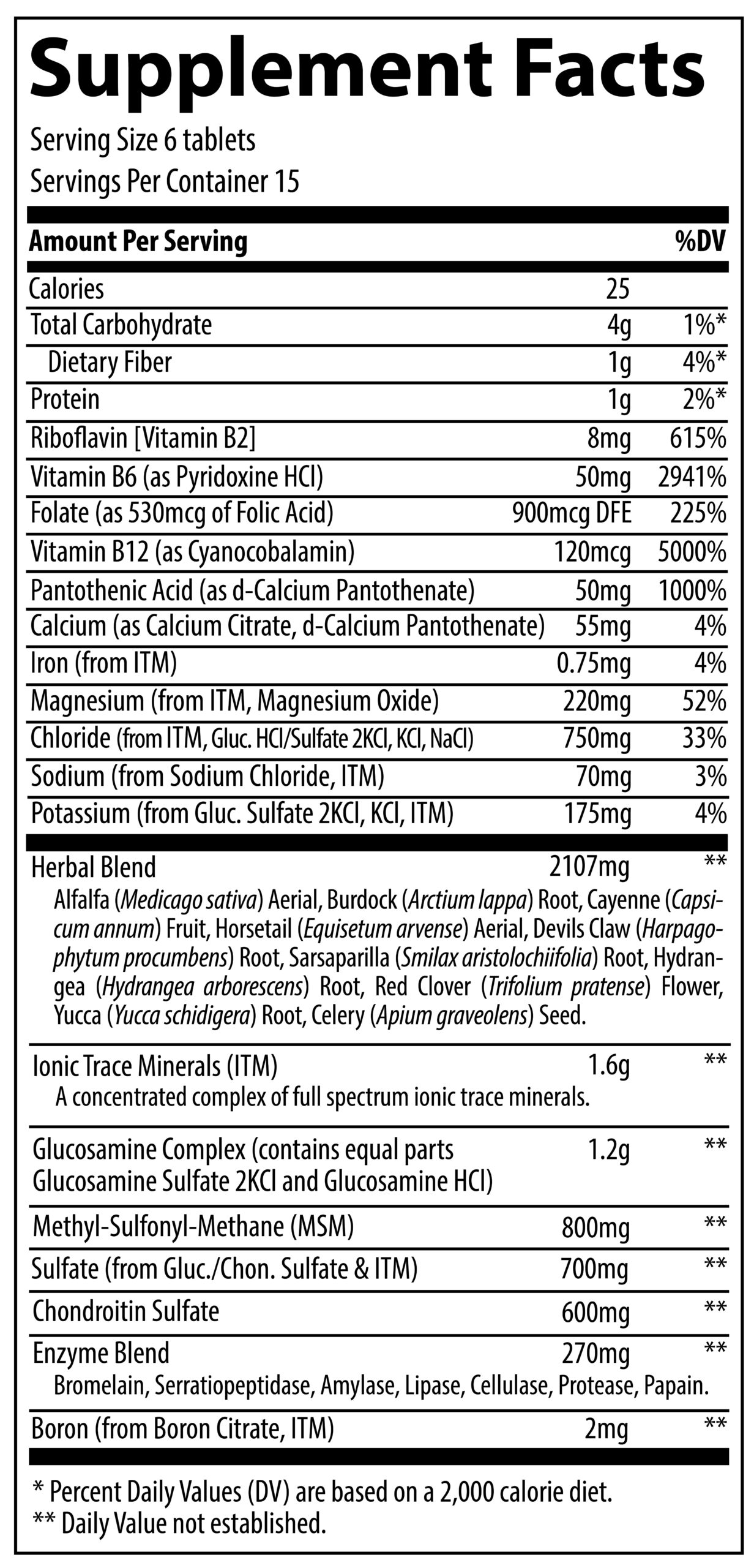 - Herbal Blend: Alfalfa leaf, Burdock Root, Capsicum Fruit, Horsetail Herb, Devils Claw Tuber, Sarsaparilla Root, Turmeric Root, Red Clover Herb, Yucca Root, Celery Seed 2 g