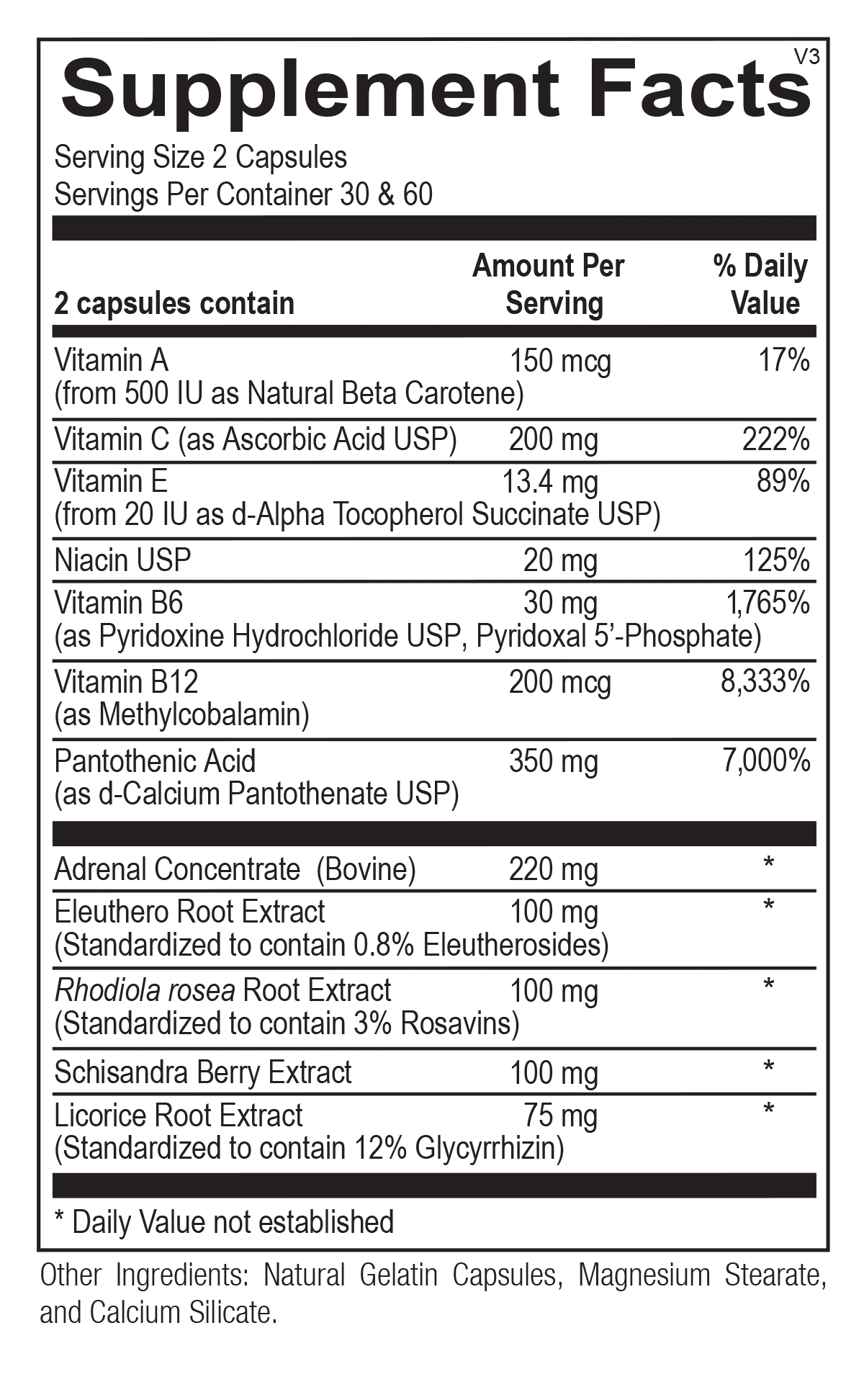 Adren-All reg contains a blend of key micronutrients, adaptogenic botanicals and adrenal concentrate specifically formulated to strengthen the body’s stress response and support healthy energy levels. Adren-All reg provides targeted amounts of vitamin A and C, pantothenic acid, and other B vitamins that are critical to adrenal gland function. This powerful formulation helps support the body’s resistance to fatigue and aids in maintaining balanced cortisol and DHEA levels.