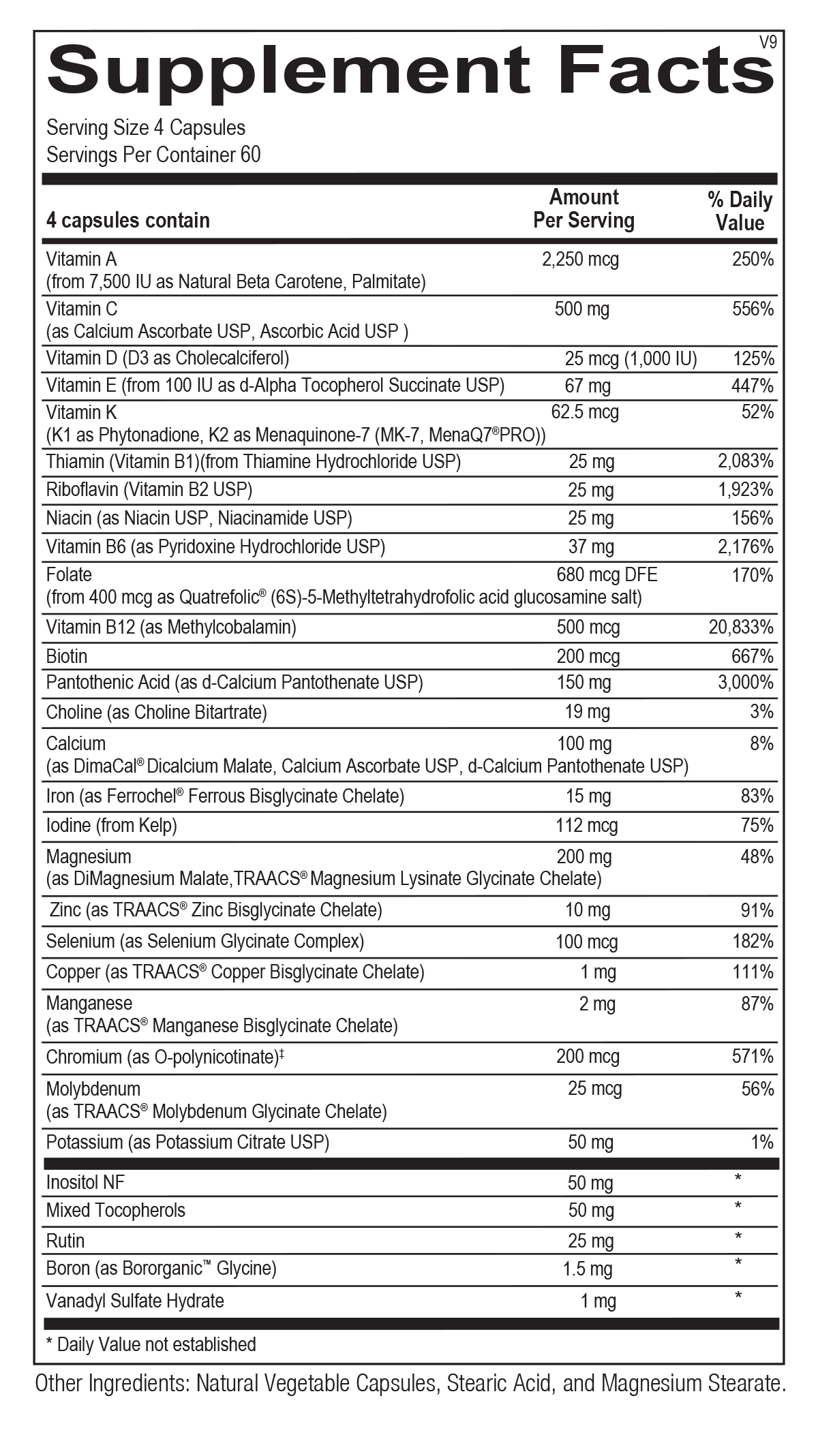 Alpha Base is a comprehensive, hypo-allergenic, multivitamin and mineral blend. As a complete multivitamin, Alpha Base provides high-quality nutrients to build a healthy micronutrient reserve. USP* B vitamins support energy production and folate (as Quatrefolic™ – 100% 5-MTHF), the biologically active form of folic acid, improves methylation. Albion® TRAACS® chelated mineral complexes enhance bioavailability. Alpha Base includes an optimal 2:1 magnesium to calcium ratio. Key antioxidants vitamin C, vitamin E and mixed tocopherols protect cells from free radical damage. Alpha Base also includes the synergistic blend of vitamin K2 (as MK-7) and D3 which are critical for supporting bone strength and cardiovascular health.