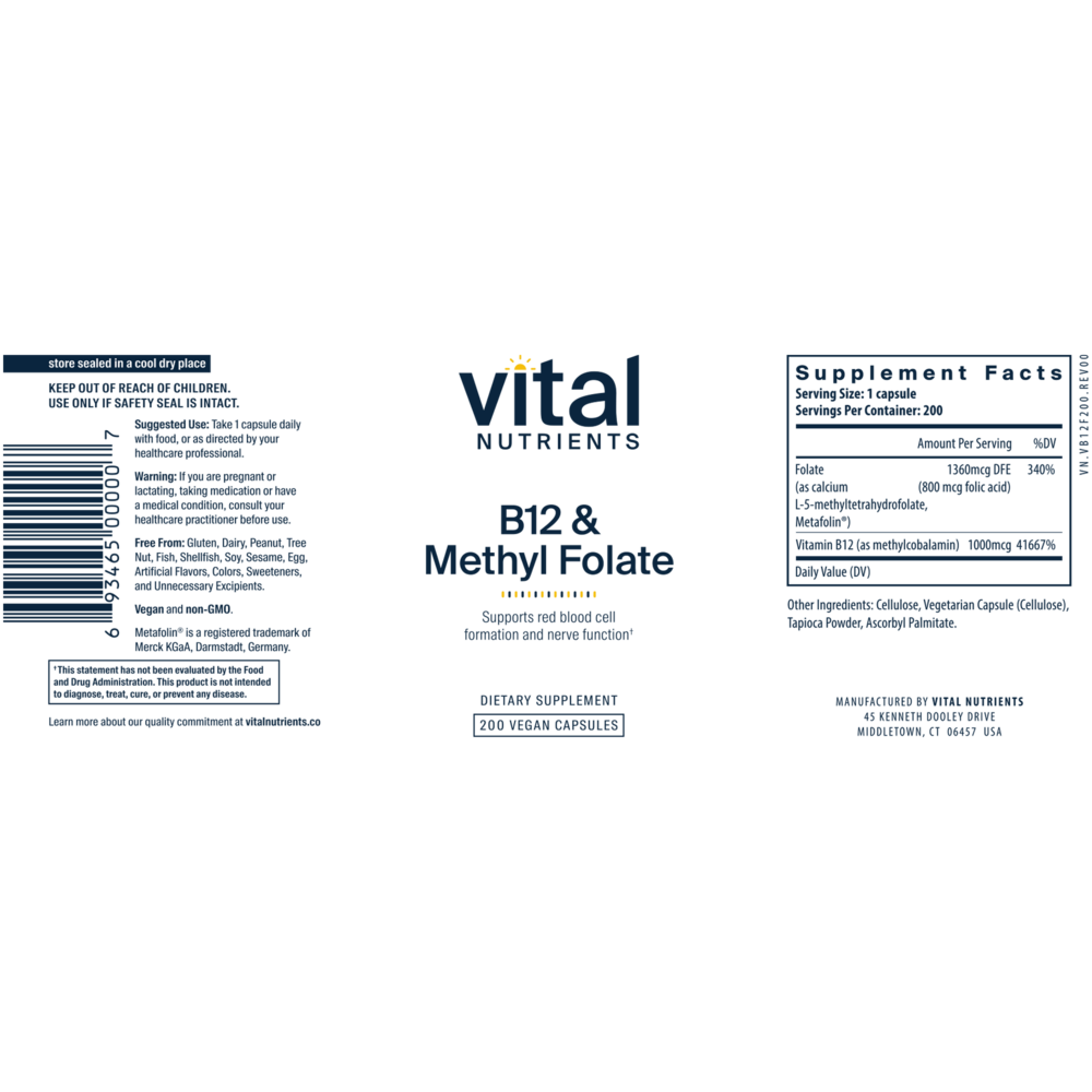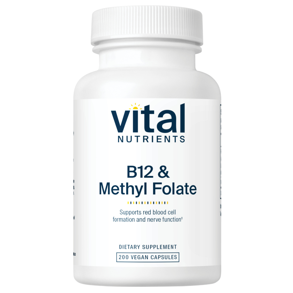 “• Supports gastrointestinal tract health* • Promotes a healthy nervous system* • Helps maintain homocysteine levels in the normal range* • Premium Vegan Formulation Vitamin B12 and Folate work together to help maintain the health of the gastrointestinal tract, nervous system and the metabolism of protein and fats.* Both maintain homocysteine levels that are already in the normal range. Adequate folate in healthful diets may reduce a woman’s risk of having a child with a brain or spinal cord birth defect. This formula contains the methylated forms of B12 (methylcobalamin) and folate (Metafolin L-5-MTHF), considered to be the most bioavailable and physiologically active forms.* Packaging and labels may vary.”