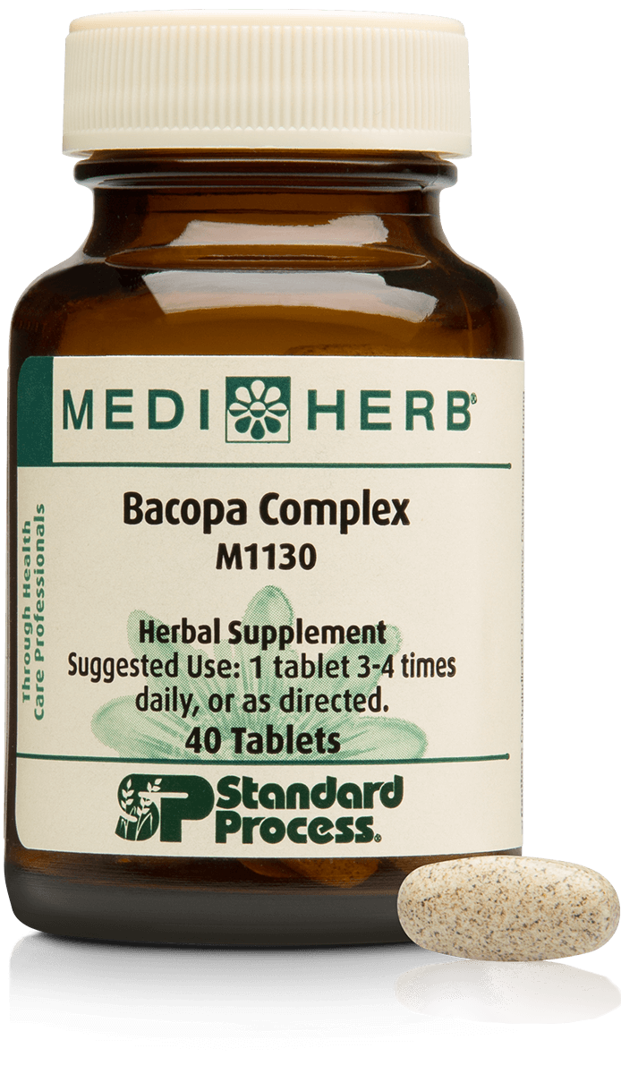 Bacopa Complex combines the herbs Bacopa, Schisandra, Eleuthero and the essential oil of Rosemary. These herbs contribute key phytochemicals to the blend such as dammarane saponins, other saponins, flavonoids, sterols, dibenzocyclooctene lignans, a diverse group of constituents called eleutherosides, monoterpenes and sesquiterpenes. This tablet contains two herbs with standardized levels of key phytochemicals to ensure optimal strength and quality. The Bacopa component is standardized to contain 37.5 mg of bacosides (a saponin mixture) per tablet, and the Eleuthero component contains 400 mcg of syringaresinol diglucosides per tablet. This formulation and the many compounds within it combine to: