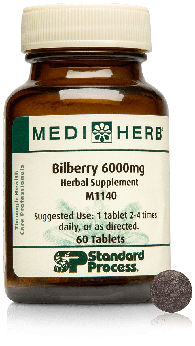 Bilberry contains anthocyanins (also called anthocyanosides, which are the blue pigments responsible for the color of ripe Bilberries), flavonoids, oligomeric procyanidins and other phytochemicals. This product is standardized to contain 21.6 mg of anthocyanosides per tablet to ensure optimal strength and quality. The phytochemicals in Bilberry work together to: