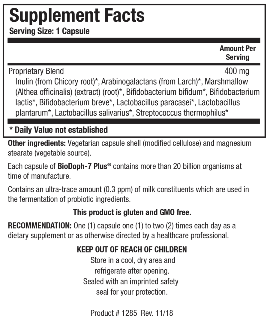 - One (1) capsule one to two times each day as a dietary supplement or as directed by a healthcare professional. Keep out of reach of children. Store in a cool, dry area and refrigerate after opening. Note: This product contains an ultra-trace amount (0.3 ppm) of milk constituents, which are used in the fermentation of the probiotic ingredients.