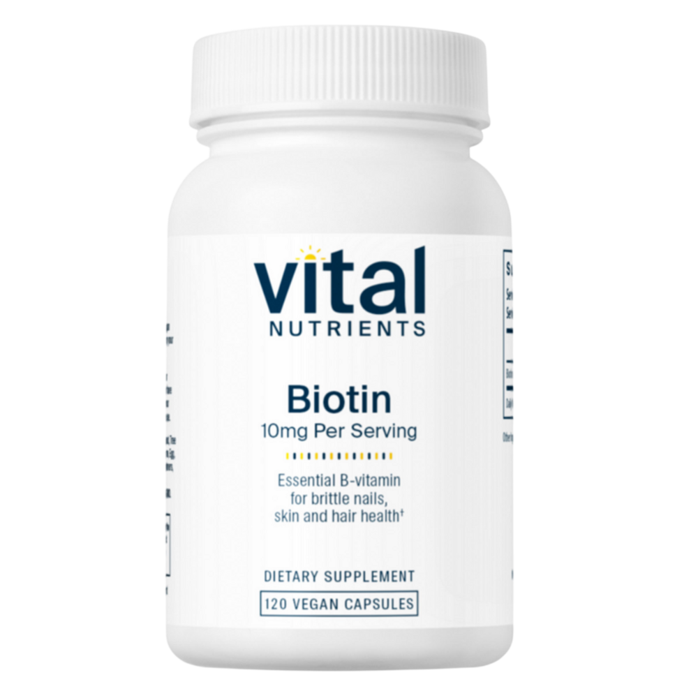 • Supports healthy skin, hair, and nails* • Supports cellular engergy production* • Promotes metabolism of carbohydrates and fat to energy* Biotin 10mg is a water-soluble B vitamin and an important component of enzymes in the body that convert fats and carbohydrates to energy. Supporting healthy skin, hair, and nail proteins is one of the best known biotin benefits.* Some preliminary evidence suggests that taking a biotin supplement may help promote healthy hair and increase nail thickness in those with brittle nails.* Pregnancy, diabetes, smoking and alcohol exposure may increase risk of biotin deficiency. Packaging and labels may vary.