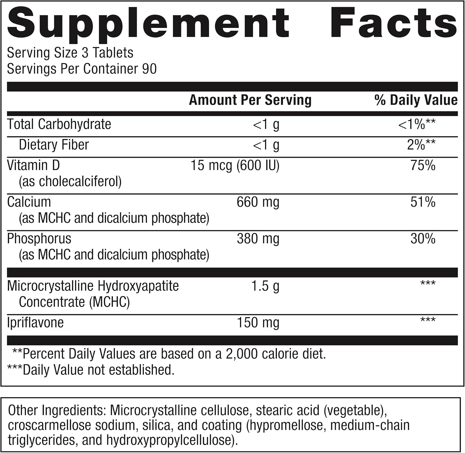 Cal Apatite Bone Builder Prime provides excellent bone health support with microcrystalline hydroxyapatite concentrate (MCHC), a highly absorbable crystalline compound that provides everything found in healthy bones and is backed by more than 30 years of research. MCHC contains naturally occurring calcium, phosphorus, and trace amounts of other minerals, bone growth factors, collagen and other vital bone proteins. This well-rounded formula is designed to support bone mineral density and also features vitamin D and ipriflavone for enhanced postmenopausal bone metabolism support.