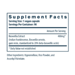 • Boswellia, also known as Indian Frankincense, is a long used and highly valued Ayurvedic herb. Boswellia may promote healthy inflammatory response by inhibiting pro-inflammatory enzymes.* By promoting a proper inflammatory balance, Boswellia may help protect cartilage and support joint function.* Boswellia may also support normal intestinal motility, providing relief from occasional gastrointestinal upset.*