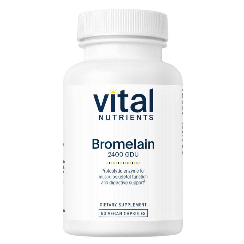 • Proteolytic enzyme from pineapple stem* • Supports a healthy digestive system* • Promotes healthy digestion* Bromelain is an enzyme found in pineapple stem, with a long history of use as a dietary supplement. Bromelain is considered a proteolytic enzyme due to its ability to break down protein when taken with food, although its benefits extend beyond digestion. When taken between meals, Bromelain helps support the body’s physiologic levels of kinins and fibrins, promoting healthy capillary blood flow to facilitate delivery of nutrients and removal of waste products.* Bromelain is particularly useful for individuals interested in promoting normal sinus, tissue, and musculoskeletal health.*