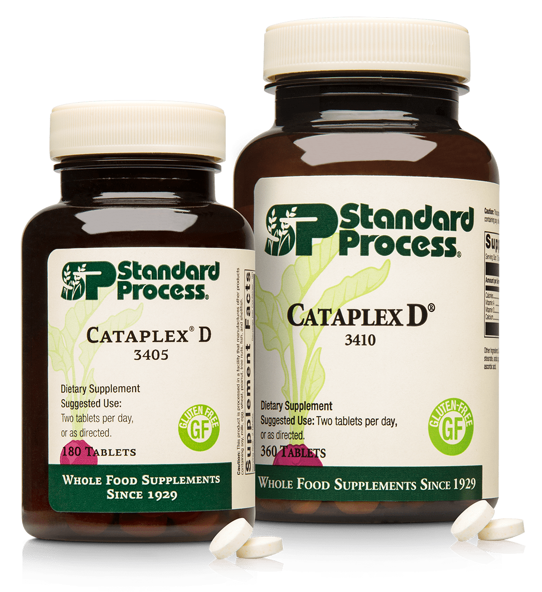 - Cataplex D provides vitamin D, which helps control blood levels of calcium and phosphate, which are raw materials used by bone-forming cells to produce woven bone for growth and normal repair. Vitamin D maintains calcium and phosphate levels to ensure correct mineralization of bones and plays a crucial role in development and maintenance of a healthy skeleton. Vitamin D also plays a role in calcium absorption. The absorption of calcium in the intestine is regulated by vitamin D, and vitamin D deficiency causes reduced calcium absorption in the gut. Vitamin D requires several other nutrients for assimilation, including calcium and vitamin A. The human body contains more calcium than any other mineral. Approximately 99 percent of that calcium is used in the bones and teeth.