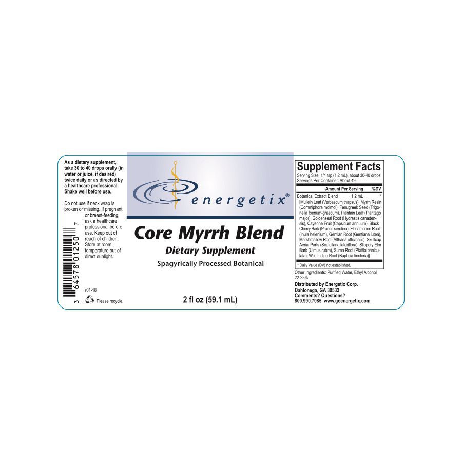Core Myrrh Blend is a botanical blend formulated to support normal respiratory function and mucosal lining health. This blend includes cayenne, fenugreek, slippery elm, mullein, and black cherry.