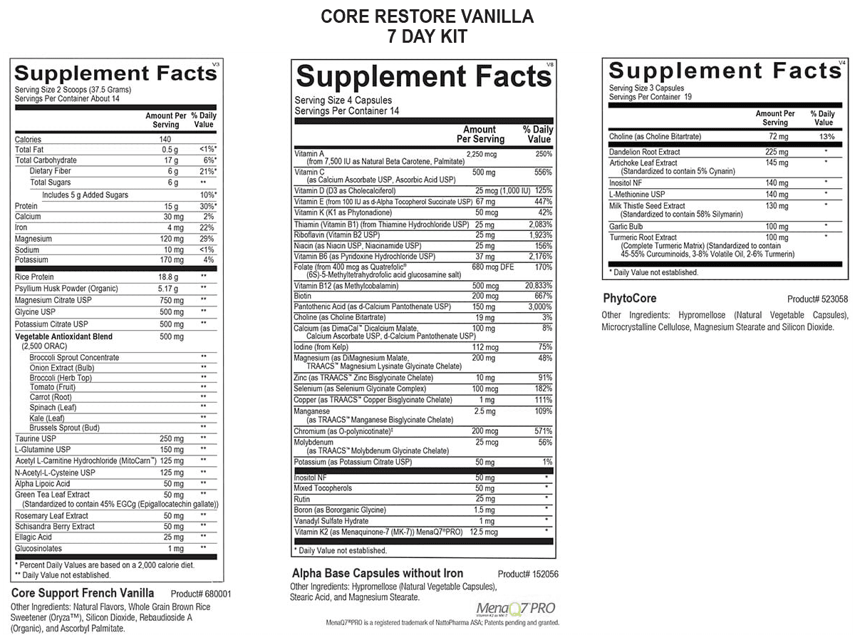 Core Restore® is a strategic system designed to safely enhance and promote the primary pathways of detoxification in the liver. The Core Restore® kit provides three active formulas – CORE Support, Alpha Base®, and PhytoCore – which function synergistically to support Phase I and Phase II pathways of liver detoxification to help neutralize environmental pollutants, hormone disruptors, unhealthy estrogen metabolites, xenoestrogens (synthetic compounds that imitate estrogen), and other harmful toxins. This powerful trio of specialized formulas provides essential micronutrients, phytonutrients, and a source of easily digested, low-allergen protein that purifies the liver and fuel optimal biotransformation.