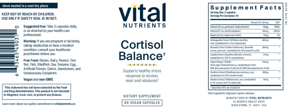 • Targets the 3Rs of Cortisol Balance: Recover cortisol function, Reset stress responses, and Rebalance metabolism for comprehensive adrenal and cortisol support* • Formulated With: Ashwagandha, Bioavailable B vitamins, Magnesium, Boswellia, Copaiba Oil, DHA (triglyceride form), and Rhodiola • Premium Vegan Formulation Cortisol Balance is the first complete, plant-based dietary supplement to specifically target the 3Rs of cortisol balance: Recover cortisol function for hormone balance, Reset cellular communication to support stress relief, and Rebalance metabolism for ongoing adrenal maintenance.* By effectively addressing these three elements, this formula encourages balanced cortisol levels to promote calm, focus, and clarity throughout the day, and restful sleep at night. This advanced formulation supports healthy energy production, while simultaneously promoting a calm state and balanced moods.* By addressing the 3Rs, Cortisol Balance also supports healthy immune function and inflammatory responses. This vegan formula is clinically supported to help the parasympathetic system recover, reset circadian rhythm, and rebalance the neuroendocrine system, which in turn supports a healthy response to stress and anxiousness.* Cortisol Balance delivers scientifically substantiated adaptogenic herbs along with targeted nutrients for adrenal and neuroendocrine support. These clinically validated ingredients effectively support and balance the entire adrenal/HPA axis, endocannabinoid system, immune system, and metabolic system without the use of CBD, hemp oil, or other hemp-derived ingredients. Balance between these systems is critical for ongoing stress response and management, supporting positive mood states, healthy sleep, and maintaining optimal cortisol function.*