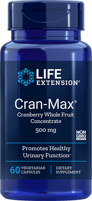 Cranberries have been known for decades to promote a healthy urinary tract. Clinical research demonstrates that cranberry’s proanthocyanidins are powerful antioxidants that can reduce oxidative stress. A double-blind comparison study confirms that Cran-Max helps support a healthy urinary tract. Each Life Extension Cran-Max capsule contains 500 mg of cranberry concentrate to promote urinary tract health.