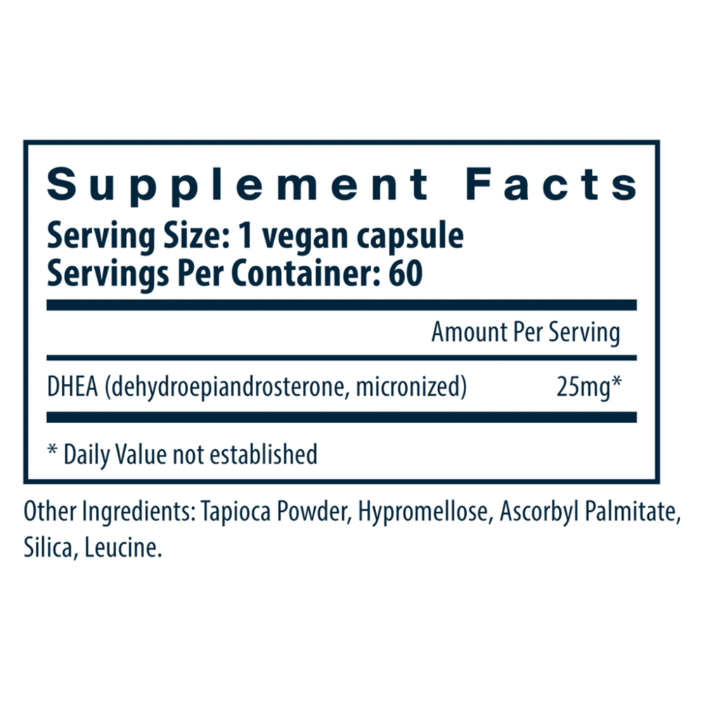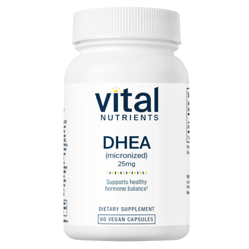 • Hormone precursor to androgens* • Supports estrogen and testosterone levels already in the normal range* • Maintains healthy energy levels* Levels of DHEA can decline with age as part of the natural aging process. DHEA is a hormone that is produced in our bodies by the adrenal glands and the levels of this hormone may begin to decline after the age of 30. Supplementing may help replenish what our bodies lose over time, to support healthy aging. DHEA is a precursor to androgens, and along with other adrenal hormones, supports fat, sugar and mineral metabolism, immune response, energy levels, and estrogen and testosterone levels.* Vital Nutrients DHEA is micronized to help increase absorption in the body.*