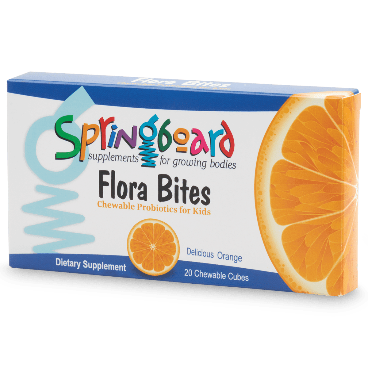 Flora Bites is a tasty, chewable probiotic for children that supports healthy gut microflora, immune function, and digestive health, featuring a blend of 5 billion CFU of beneficial bacteria and vitamin C in a fun, natural orange-flavored cube.