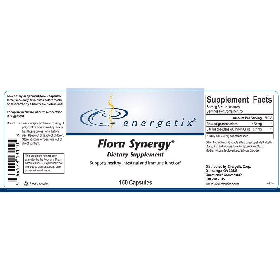 Flora Synergy is a high-quality probiotic supplement designed to support digestive health and overall well-being. Each bottle contains 150 capsules of a balanced blend of beneficial bacterial strains to promote a healthy gut microbiome.