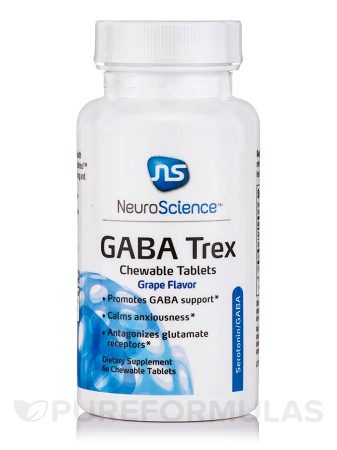 • GABA Trex is an easy-to-administer chewable tablet providing rapid delivery of contents for calming relief. GABA Trex contains the amino acid L-theanine, which has been widely studied for its ability to produce a calming effect and prevent over-stimulation. It has been postulated that L-theanine’s effects are due to its ability to antagonize glutamate receptors, thereby dampening excessive stimulatory neurotransmission. L-theanine indirectly supports GABA activity by dampening glutamate receptors, which frees GABA to perform other functions. It is recommended to address elevated glutamate levels and for patients with overstimulation.