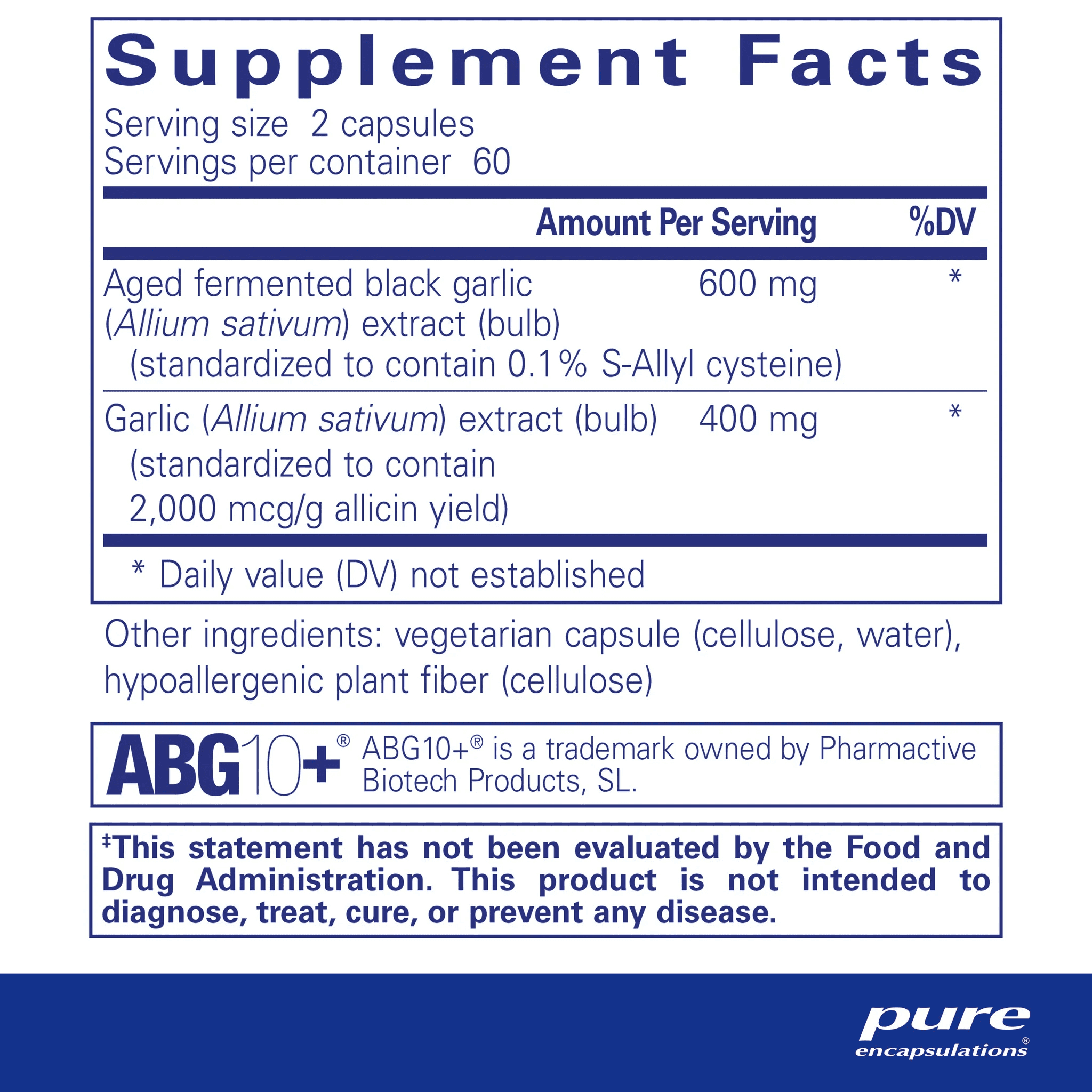 - Our Garlic Complex supplement provides a unique combination of aged fermented black garlic extract and garlic extract, while reducing the odor and sharp taste typically associated with raw garlic and garlic extracts. This combination offers heart and immune support, specifically broad-spectrum cardiovascular health, including support for healthy blood flow and platelet function, and arterial function along with the healthy breakdown of fats. In addition, Garlic Complex provides support for maintaining a healthy gut and promoting immune system function.