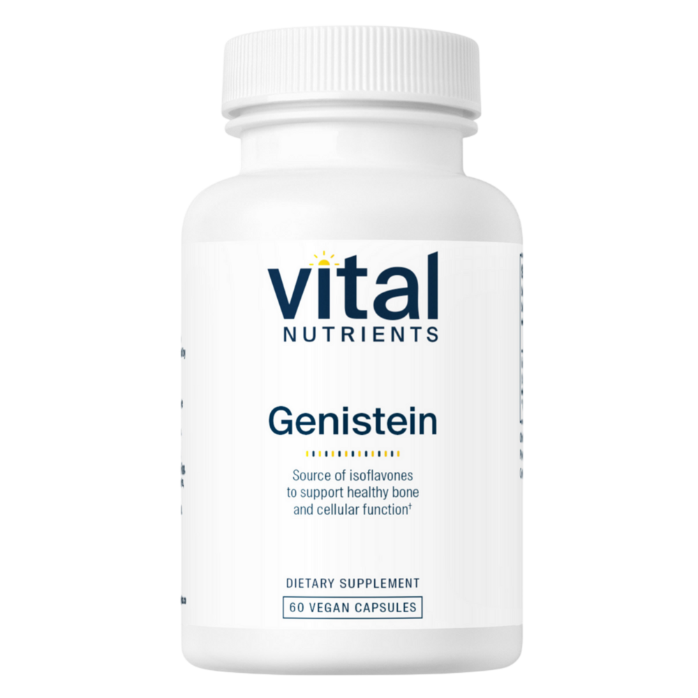 • Readily absorbed aglycone form of isoflavones* • Helps maintain normal cell function and growth* • Support immune system and bone marrow health* Genistein contains 125mg of Genistein and generally contains 88-100mg of daidzein, the major isoflavone aglycones.* Genistein has been shown to help maintain normal cell function and growth.* Genistein and daidzein also promote and support immune system and bone marrow health.* The isoflavone glucosides (isoflavone linked to glucose) genistin, daidzin and glycitin are not present in this product.* Most soy products on the market contain isoflavone glucosides and few isoflavone aglycones (isoflavone without the glucose attached).* Isoflavone aglycones are the desired form and are more rapidly and better absorbed than isoflavone glucosides.*