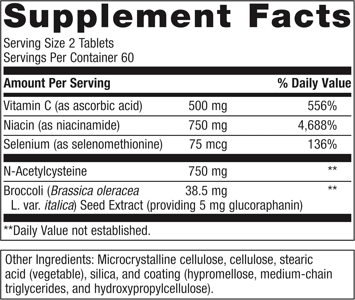 • Broccoli (Brassica oleracea L. var. italica) Seed Extract (providing 5 mg sulforaphane glucosinolate) — 38.5 mg — *