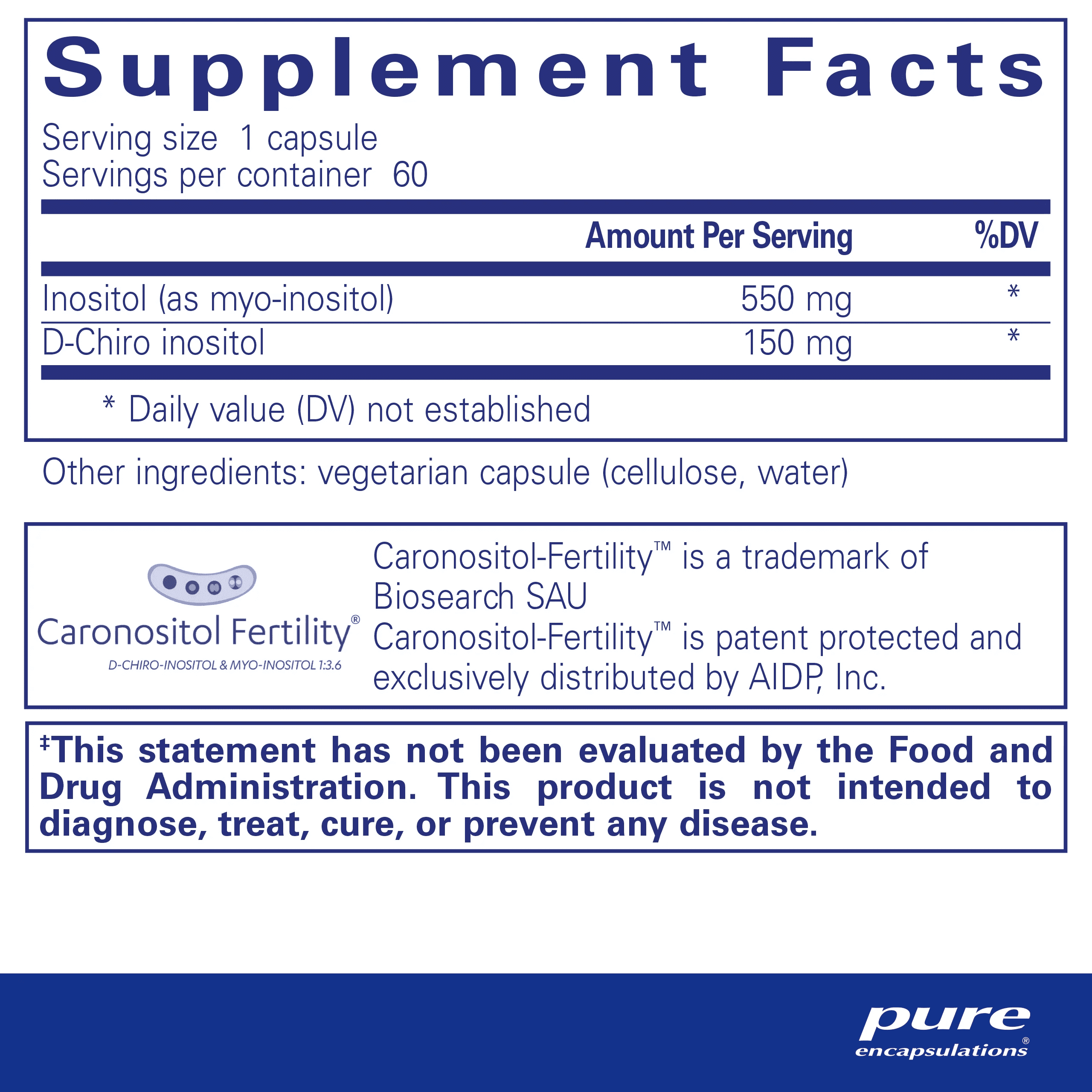 Inositol is a component of the B-complex family. Myo-inositol is the most common form of inositol in the body and plays an important role in cell membrane formation as well as promoting positive mood and emotional wellness. D-chiro inositol is another form of inositol in the body that assists with healthy insulin signaling and the balancing of hormones like androgens and luteinizing hormone/follicle stimulating hormone (LH/FSH). In our Inositol Complex, we’ve developed the optimal ratio of myo-inositol to D-chiro inositol to encourage healthy ovarian and reproductive function, glucose homeostasis, insulin function and emotional wellness.