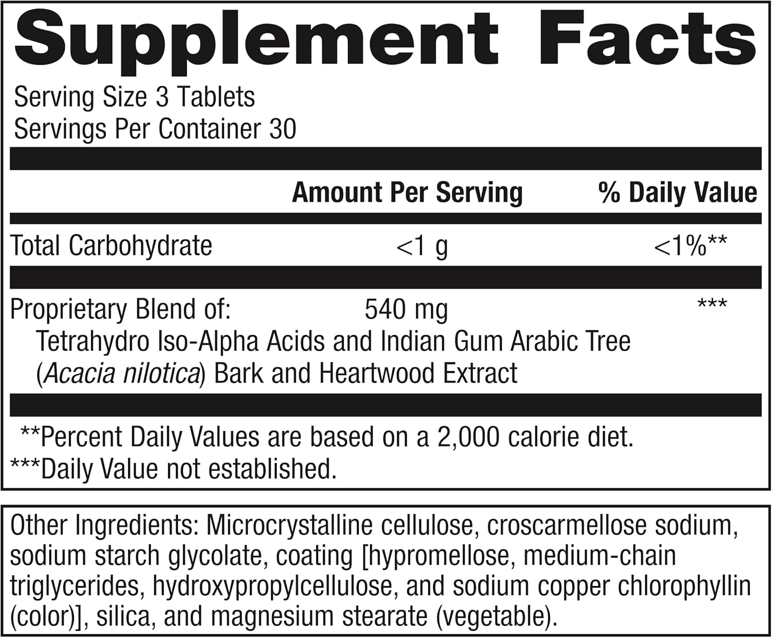 - Ingredients: A proprietary blend of: Reduced Iso-Alpha Acids, Acacia Bark and Heartwood Extract (Acacia nilotica)