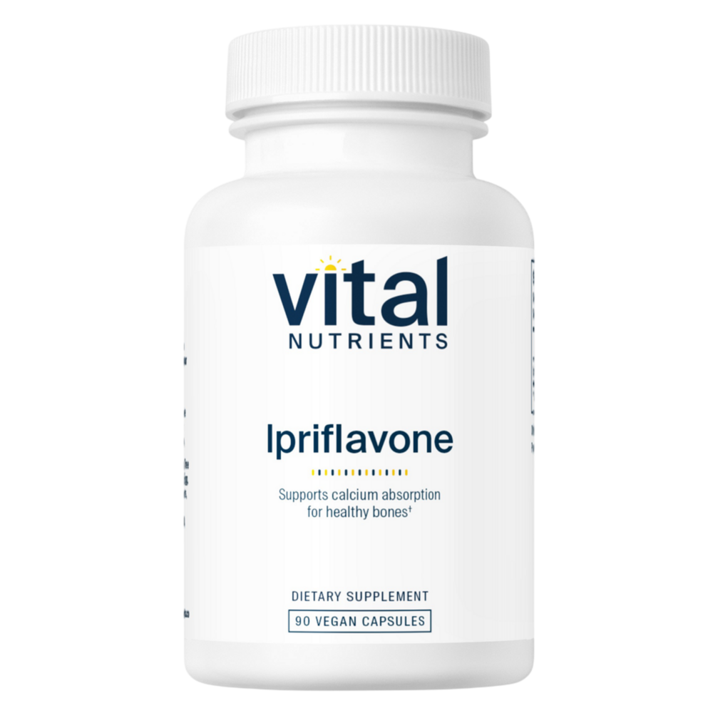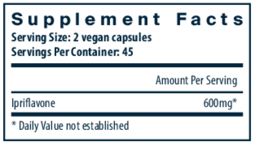• Promotes calcium absorption in the intestines* • Supports calcitonin secretion from the thyroid* • Helps regulate osteoclastic activity* • Premium Vegan Formulation Ipriflavone is a derivative of the soy isoflavone daidzein, used to support bone health.* Ipriflavone promotes the secretion of calcitonin from the thyroid, which helps maintain a normal balance of osteoclastic (bone resorption) activity in the bones as they undergo continuous remodeling.* Ipriflavone also helps support calcium absorption in the intestines and promote bone mineralization.* Packaging and labels may vary.