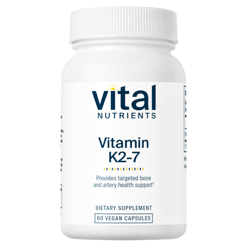 • Supports healthy bone mineralization* • Promotes vascular elasticity* • May support healthy lipid levels* • Premium Vegan Formulation Vitamin K2-7 (menaquinone) supports bone and cardiovascular health.* Vitamin K2-7 supports healthy bone mineralization by acting as a cofactor in the carboxylation of osteocalcin, allowing calcium to bind to this protein in the extracellular matrix of bone.* Vitamin K2-7 also supports healthy cardiac and vascular function.* This form of Vitamin K concentrates in the tissues of the arteries, where it aids in carboxylation of Matrix Gla Protein to help maintain normal calcium metabolism and support healthy vascular elasticity.* Additionally vitamin K2 may help support healthy lipid levels and glucose metabolism.* Research suggests the Western diet may not contain sufficient Vitamin K2-7 to optimize carboxylation of Gla outside the liver.* Higher dietary intakes of K2 have been associated with healthy levels of arterial calcification and elasticity.* Compared to other forms of Vitamin K, Vitamin K2-7 has a longer half-life, resulting in more stable levels in the body.* For best absorption, take with a mixed meal or some healthy dietary fat.* Packaging and labels may vary.