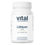 "• Supports healthy neurotransmitter activity* • Enhances Vitamin B12 and Folate transport into L1210 brain cells* • May support mental and behavioral health* • Premium Vegan Formulation Lithium is an alkali metal found in trace amounts of most rocks, as well as mineral springs, ocean water, and nearly all vertebrate tissue.* Vital Nutrients offers low-dose lithium supplied as lithium orotate, a bioavailable salt. Lithium supports the phosphoinositol pathway. Lithium may be used to promote a healthy balanced mood and behavior* Additionally, Lithium may help resist both the mental and physical effects of stress.* Packaging and labels may vary."