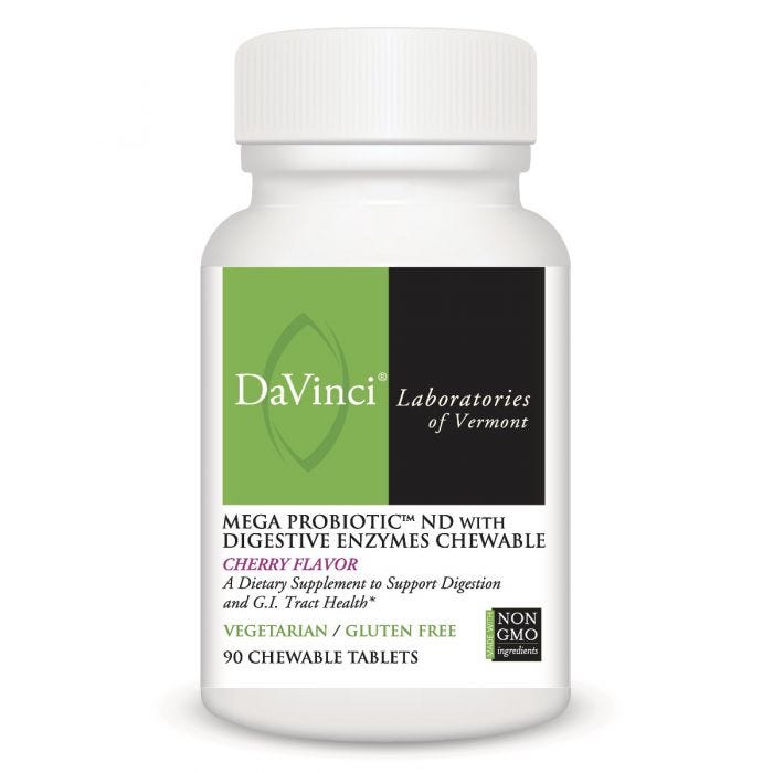 Mega Probiotic™ ND with Digestive Enzymes Chewable is a comprehensive and vegetarian supplement designed to support digestive tract function and nutrient absorption. It contains non-dairy probiotics and a broad-spectrum of enzymes that work together to support digestion and GI tract health. Mega Probiotic™ ND with Digestive Enzymes Chewable is vegetarian and ideal for people of all ages. Each chewable tablet provides 2.5 billion beneficial microorganisms along with Amylase, Bromelain, lactase, Lipase, Protease and cellulose in a delicious, natural cherry flavored chewable tablet.