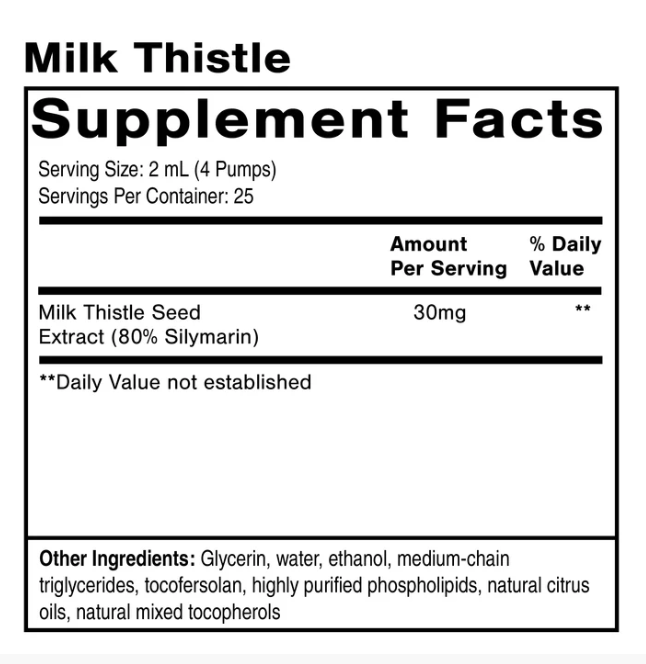 Each 2 mL delivers 30 mg of milk thistle extract (highly standardized to 80% Silymarin).