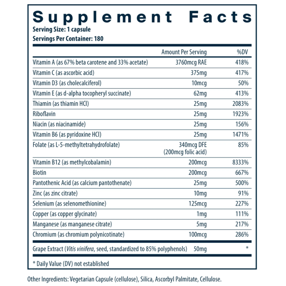 • Convenient one or two a day multi-vitamin* • Potent antioxidants help prevent against free radicals* • B vitamins help maintain healthy protein, fat, and carbohydrate metabolism* Minimal & Essential® is a full-spectrum one- or two-a-day multi-vitamin/mineral formula that provides the minimum daily requirements of vitamins and some essential minerals.* This formula contains a potent antioxidant complex including vitamins A, C, E and the mineral selenium.* It contains a range of B vitamins, which are used in the metabolism of protein and fats, and maintenance of muscle tone in the gastrointestinal tract.* B vitamins also support healthy nerve cells and maintain homocysteine levels that are already in the normal range.*
