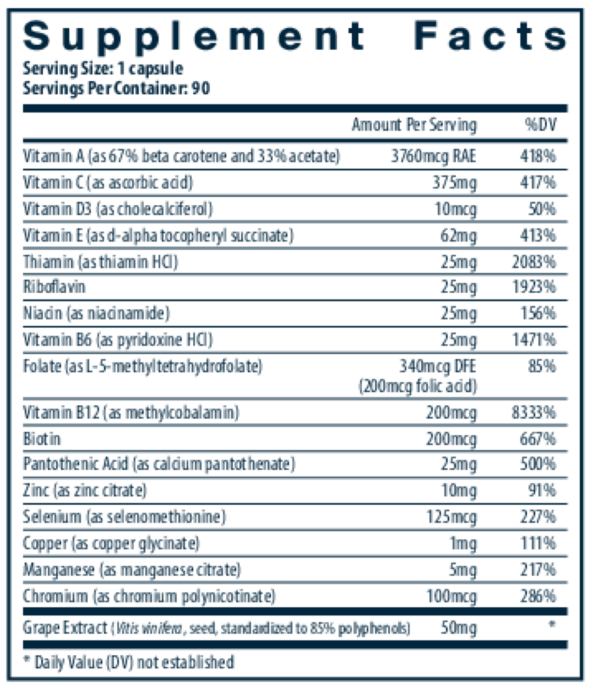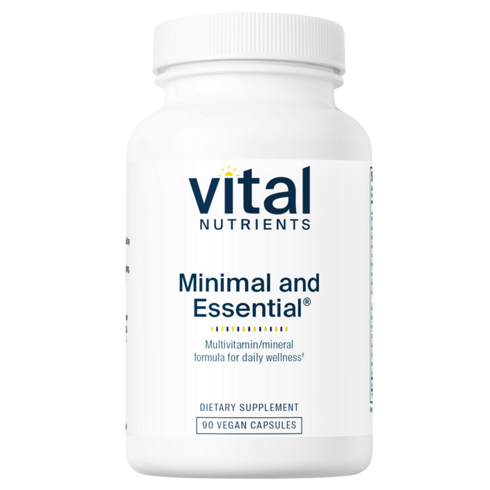 • Convenient one or two a day multi-vitamin* • Potent antioxidants help prevent against free radicals* • B vitamins help maintain healthy protein, fat, and carbohydrate metabolism* Minimal & Essential® is a full-spectrum one- or two-a-day multi-vitamin/mineral formula that provides the minimum daily requirements of vitamins and some essential minerals.* This formula contains a potent antioxidant complex including vitamins A, C, E and the mineral selenium.* It contains a range of B vitamins, which are used in the metabolism of protein and fats, and maintenance of muscle tone in the gastrointestinal tract.* B vitamins also support healthy nerve cells and maintain homocysteine levels that are already in the normal range.*
