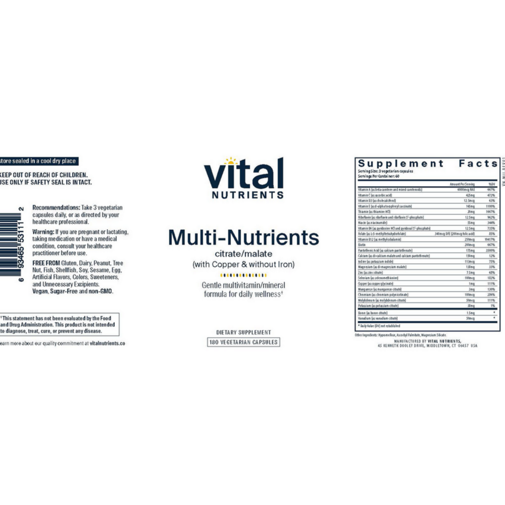 • Easily absorbed minerals* • Contains 500 IU of Vitamin D3 • Supports bone, skin, cardiovascular, liver, and immune health* • Vegetarian Formula Multi-Nutrients 2 is a high potency multi-vitamin/mineral and trace element formula that provides the highest nutritional value for all systems of the body, including bone, skin, cardiovascular, liver, and immune support.* This formula incorporates premium ingredients to ensure optimal absorption and physiological activity, including folate as Metafolin® L-5-MTHF, Vitamin D3, potent antioxidants and mineral amino acid chelates.* It is a bioavailable, gentle formula that is well tolerated by most individuals.* Multi-Nutrients 2 contains minerals in citrate/malate form for better absorption.* This formula contains copper and does not contain iron.* Packaging and labels may vary.