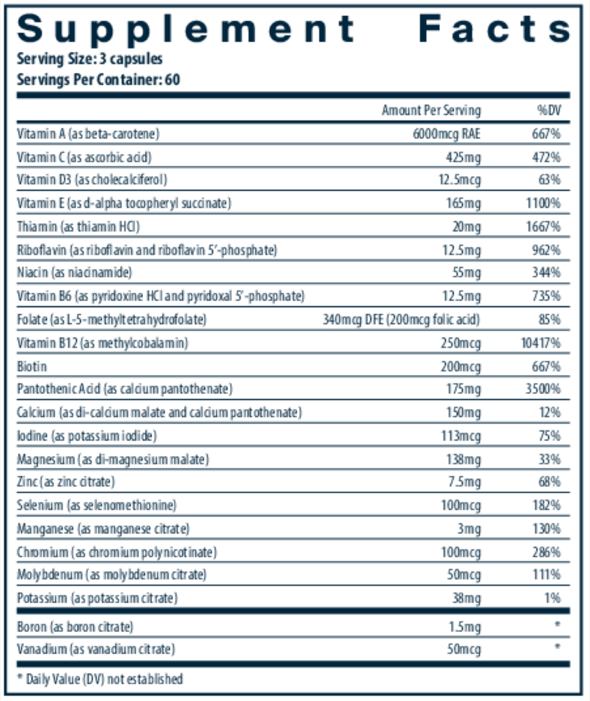 • Easily absorbed minerals* • Contains 500 IU of Vitamin D3 • Bone, skin, cardiovascular, liver, and immune support* Multi-Nutrients 3 is a high potency multi-vitamin/mineral and trace element formula that provides the highest nutritional value for all systems of the body, including bone, skin, cardiovascular, liver, and immune support.* This formula incorporates premium ingredients to ensure optimal absorption and physiological activity, including folate as Metafolin® L-5-MTHF, Vitamin D3, potent antioxidants and mineral amino acid chelates.* It is a bioavailable, gentle formula that is well tolerated by most individuals.* Multi-Nutrients 3 contains minerals in citrate/malate form for better absorption.* This formula contains copper and does not contain iron.*• This formula does not contains copper or iron.*