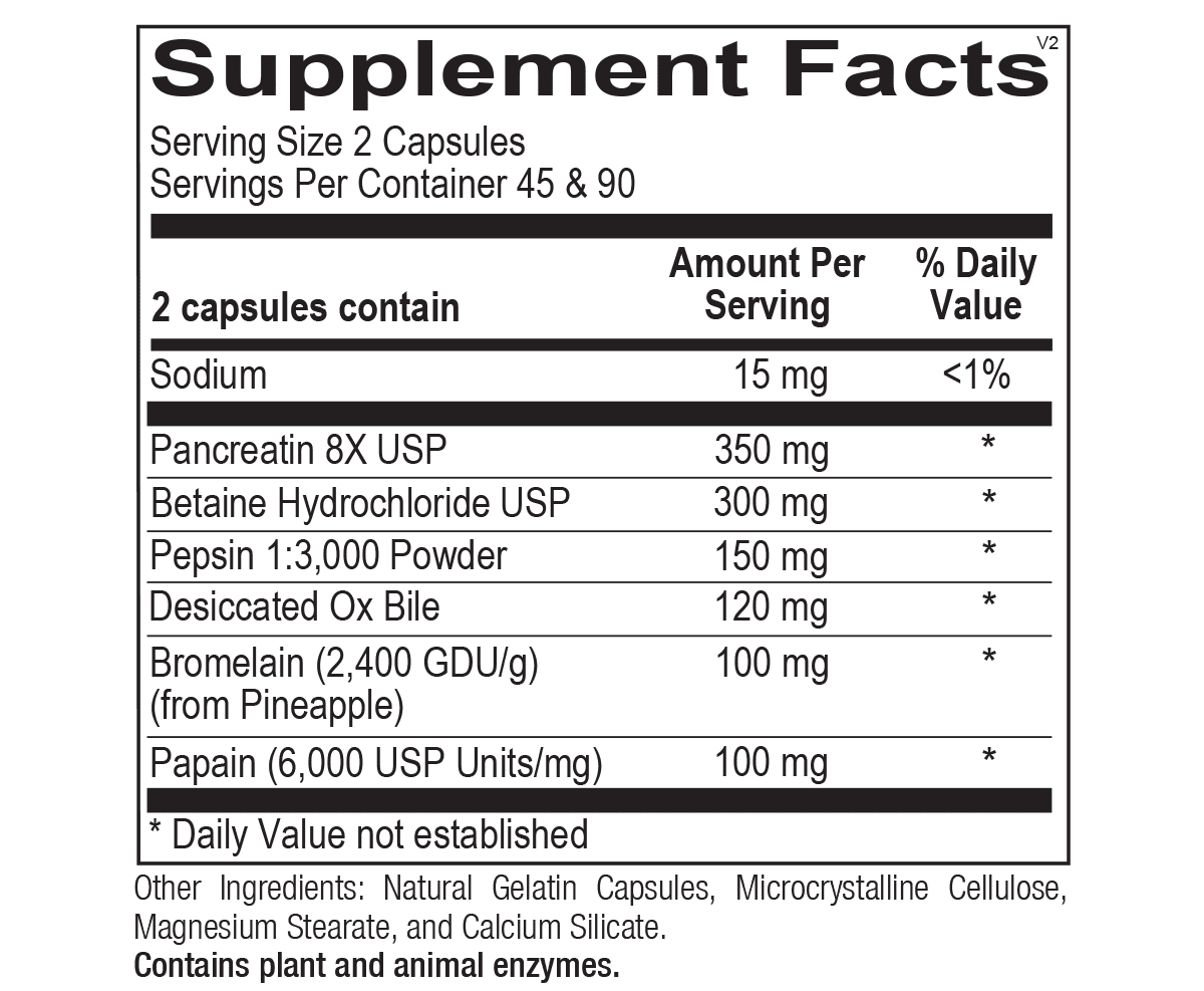 • Enteric Phase Digestion (Small Intestine) – Pancreatin, bromelain, papain and ox bile extract support enteric phase digestion in the small intestine for further digestion of proteins and fats.