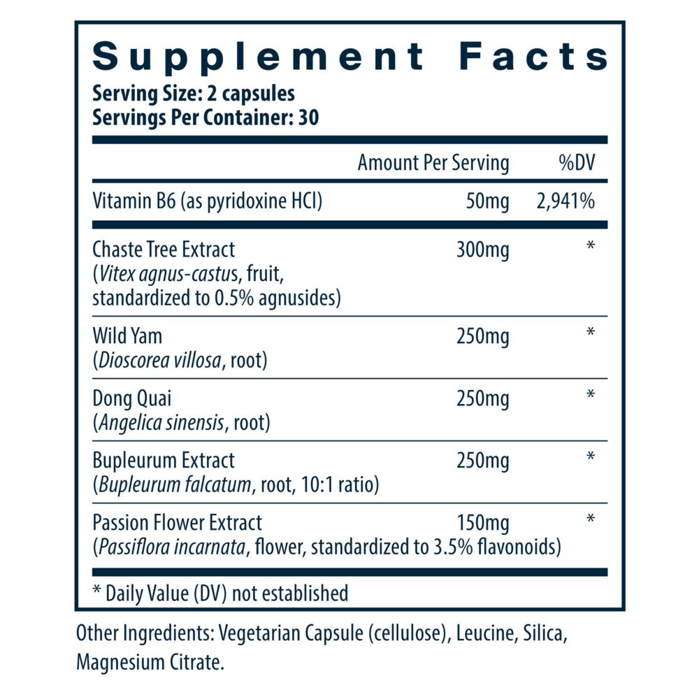 • Helps alleviate minor discomforts associated with the menstrual cycle* • Supports healthy progesterone levels* • Helps moderate luteinizing hormone production* PMS Support is a combination of herbal extracts formulated specifically to help women who experience common mild symptoms associated with their monthly menstrual cycle.* The herb Vitex acts on the pituitary gland, which modulates the production of luteinizing hormone.* This supports progesterone production and helps maintain a regular monthly cycle.* Dong Quai, another herb in this formula, acts to relax smooth muscles, relieving minor discomforts associated with the menstrual cycle.*