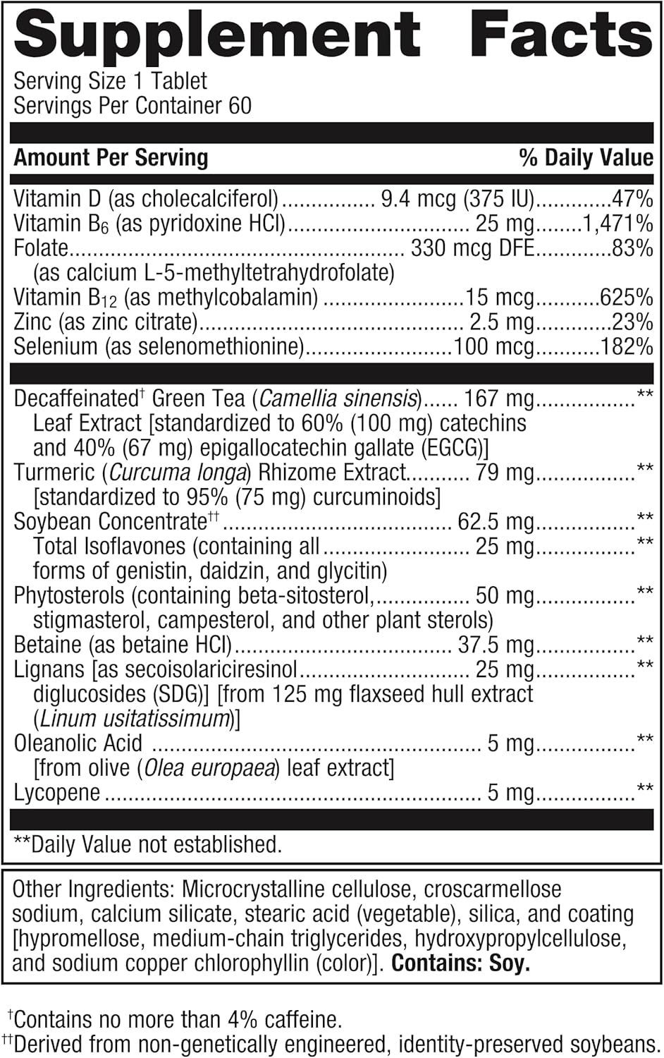 Ingredients: Decaffeinated green tea leaf extract, microcrystalline cellulose, flax seed extract, turmeric rhizome extract, stearic acid (vegetable), soy isoflavones (soy), phytosterols (soy), lycopene, betaine HCl, croscarmellose sodium, calcium silicate, pyridoxine HCl, cellulose, selenomethionine, silica, zinc citrate, oleanolic acid, cholecalciferol, folic acid, methylcobalamine, and coating (hypromellose, medium chain triglycerides, hydroxypropylcellulose, and sodium copper chlorophyllin). Contains: soy.