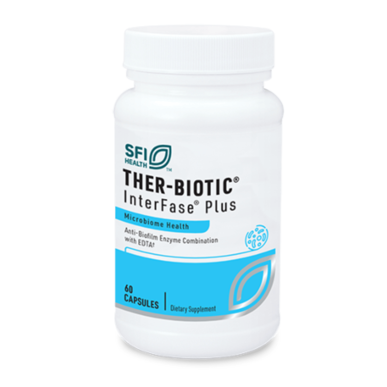 - Includes EDTA which binds the metals needed for biofilm formation. Ther-Biotic InterFase Plus.