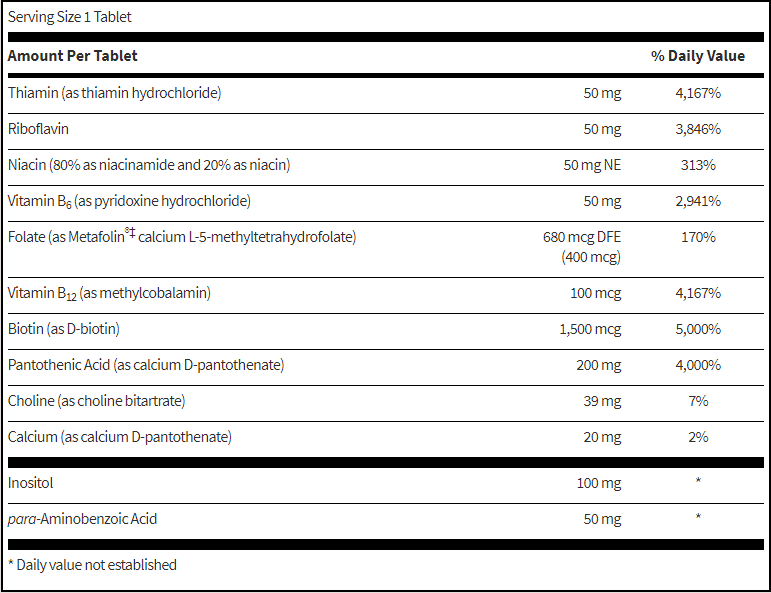 A full complement of bioavailable essential B-vitamins plus related nutrients in high-potency amounts.
