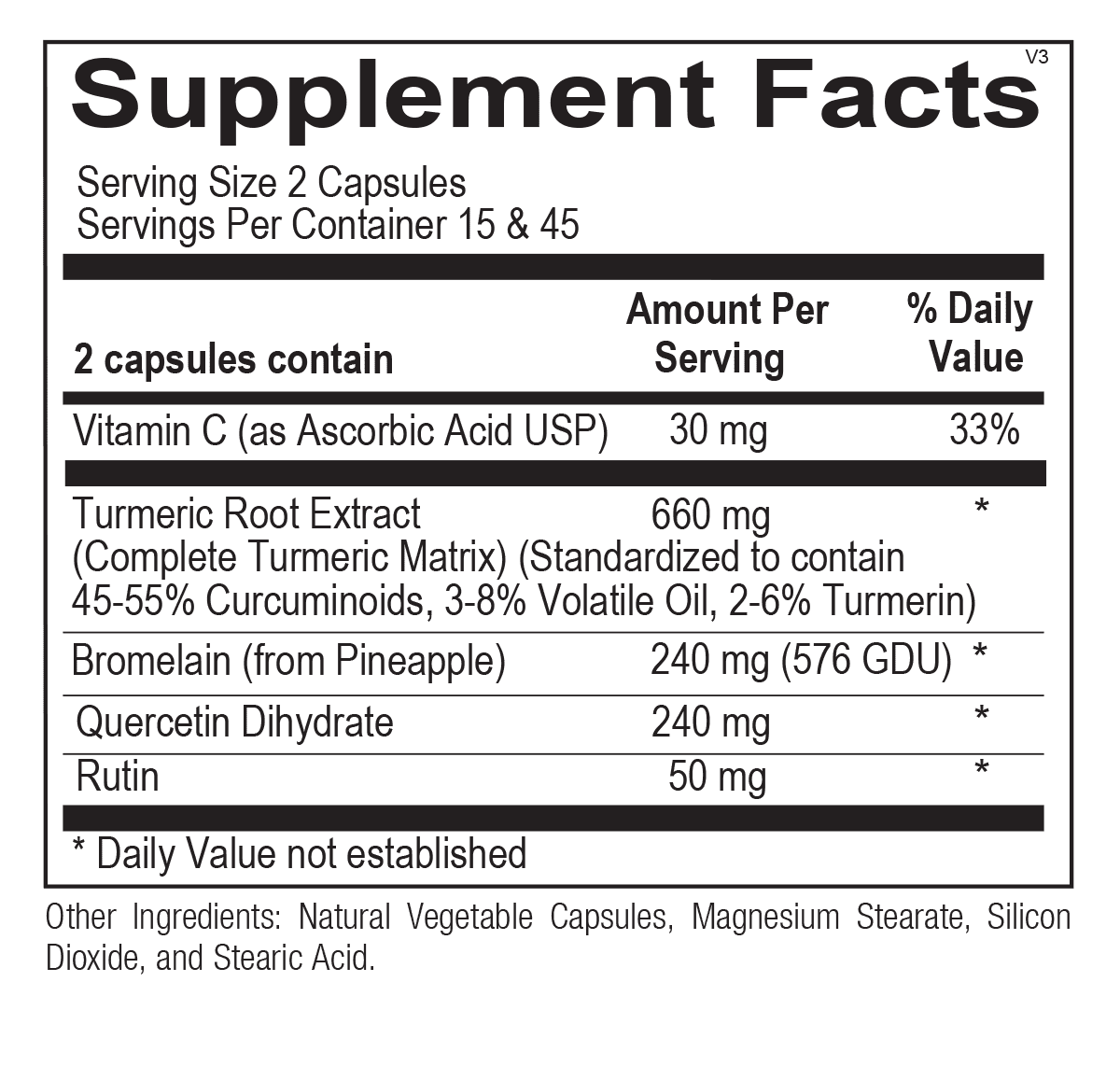 Traumeric combines a complete turmeric matrix, quercetin, rutin, and bromelain for enhanced joint function and to maintain a normal inflammatory balance systemically.