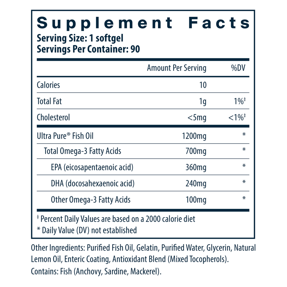 • Citrus free with enteric coating to prevent repeating* • High concentration of EPA & DHA • Maintains normal platelet aggregation levels* Ultra Pure® Fish Oil 700 Enteric is enteric coated to eliminate unpleasant repeating. It is formulated to provide a higher concentration of EPA and DHA per capsule without lemon flavor. Fish oil provides support and maintenance of the normal function, fluidity and health of cell membranes.* The essential fats EPA and DHA help maintain and support soft tissue and connective tissue.* Fish oil helps promote cartilage and joint function and relieves mild mood changes and cramps associated with the menstrual cycle.* Fish oil helps maintain platelet aggregation levels that are already in the normal range.* Ultra Pure Fish Oil 700 Enteric capsules do not contain lemon flavor.